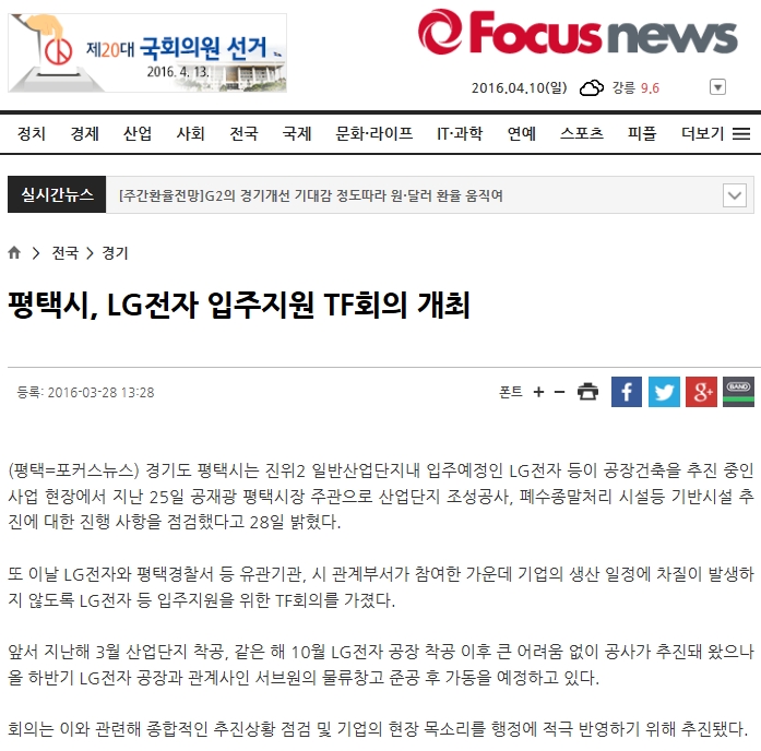 (평택=포커스뉴스) 경기도 평택시는 진위2 일반산업단지내 입주예정인 LG전자 등이 공장건축을 추진 중인 사업 현장에서 지난 25일 공재광 평택시장 주관으로 산업단지 조성공사, 폐수종말처리 시설등 기반시설 추진에 대한 진행 사항을 점검했다고 28일 밝혔다. 또 이날 LG전자와 평택경찰서 등 유관기관, 시 관계부서가 참여한 가운데 기업의 생산 일정에 차질이 발생하지 않도록 LG전자 등 입주지원을 위한 TF회의를 가졌다. 앞서 지난해 3월 산업단지 착공, 같은 해 10월 LG전자 공장 착공 이후 큰 어려움 없이 공사가 추진돼 왔으나 올 하반기 LG전자 공장과 관계사인 서브원의 물류창고 준공 후 가동을 예정하고 있다. 회의는 이와 관련해 종합적인 추진상황 점검 및 기업의 현장 목소리를 행정에 적극 반영하기 위해 추진됐다. 이날 회의에서 산업단지 주변도로 및 산업용 전력공급계획, 폐수종말처리시설 공사현황 등 기반시설 추진현황을 종합적으로 점검했다. 공재광 평택시장은 "이번에 새롭게 투자를 결정한 LG전자의 기업투자활동을 위해 관계공무원과 유관기관의 지원을 당부한다"고 말했다. 이어 "지난 2월 1일 평택시와 LG전자 등이 체결한 상생협약이 구체적으로 실현되도록 평택시와 LG전자가 공동 노력해 나갈 것이며 기업의 적극적인 참여를 요청한다"라고 덧붙였다. 한편 LG전자는 1983년 가동을 시작한 51만3000㎡면적의 평택공장과 이번에 자체개발 및 신규로 공급받는 45만6000㎡를 포함해 전체 96만9000㎡ 규모로 산업용지가 확대된다. LG전자 등은 이번 신규투자에 약 5000억원을 투자하게 되고, 연인원 6000여명의 고용창출 효과가 예상될 것으로 밝힌 바 있다.