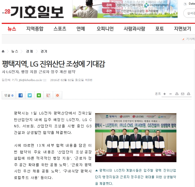 LG전자·LG CNS·서브원·GS건설 등 참여시민 우선채용 노력 약속...근로자 정주공간 확대도 평택시는 1일 진위면소재 LG전자 평택공단에서 진위2 일반산업단지에 입주 예정인 LG전자(주), (주)LG CNS, (주)서브원, GS건설(주)와 상생발전 협약을 체결했다.이날 13개 세부 사항을 담은 협약의 주요 내용은 ‘산업단지조성ㆍ공장설립에 따른 적극적인 행정지원’, ‘근로자 정주공간 확대를 위한 공동노력’, ‘근로자 평택시민 우선채용 공동노력’, ‘구내식당 평택시 로컬푸드 사용’ 등이다.이번 협약은 지난 1983년부터 진위면에 공장을 가동 중인 LG전자가 계열사 등과 함께 사업확장을 위한 부지를 마련하고 투자를 확대하면서지역사회, 시민과의 소통을 통해 상생의 폭을 넓혀 나가겠다는 확고한 의지를 표명한 것으로 시민들의 기대감이 커지고 있다.현재 LG전자는 1983년부터 가동을 시작한 51만3천000㎡ 면적의 기존 공장과 이번에 신규 공급받는 45만6천㎡를 포함해 총 96만9천㎡ 규모로 산업용지가 확대된다.신규 부지에는 산업용 공조설비를 생산하는 칠러공장 입주와 함께 향후 미래 신성장전략산업 등에 약 5천억 원이 투자돼 6천여명의 고용창출 효과가 예상된다.공재광 시장은 “이번 협약체결은 LG전자가 평택에 투자계획을 구체화하면서부터, 기업의 사회적 역할 확대와 지역사회 협력사업 참여에 대한 시의 끊임없는 구애에 대한 화답의 형태로 이루어진 것“이라며 “기업과 지역사회가 함께 공존하고 상생 발전하는 토대가 될 것으로 기대한다”고 말했다.심재용기자