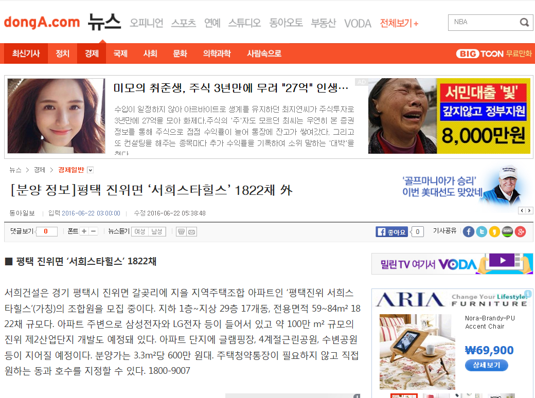 동아일보 - 평택진위면 "서희스타힐스"1822채 外