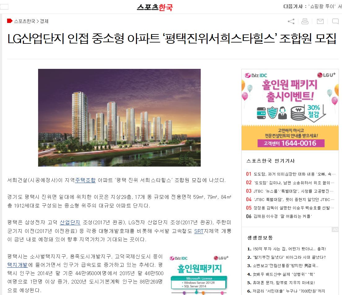 스포츠 한국 - LG산업단지 인접 중소형 아파트 ‘평택진위서희스타힐스’ 조합원 모집