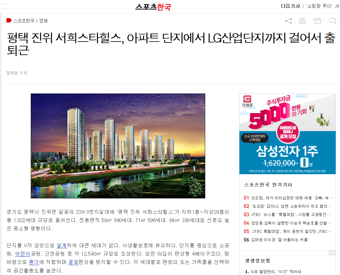 스포츠 한국 - 평택 진위 서희스타힐스, 아파트 단지에서 LG산업단지까지 걸어서 출퇴근